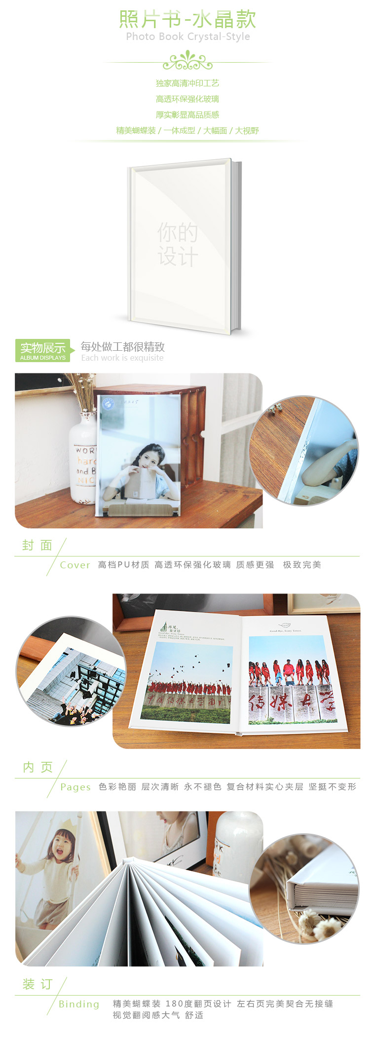 封皮高档进口PU;高透环保强化玻璃;内芯高档铜板纸和PVC夹层